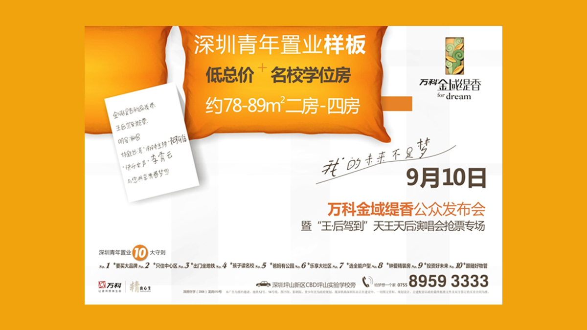 前海發(fā)布文化機構(gòu)為萬科·金域緹香實施以“贊美生命,共筑城市”為主題的品牌推廣策劃 & 品牌形象推廣,制作系列宣傳資料及展示物料,操盤房地產(chǎn)項目整合營銷。